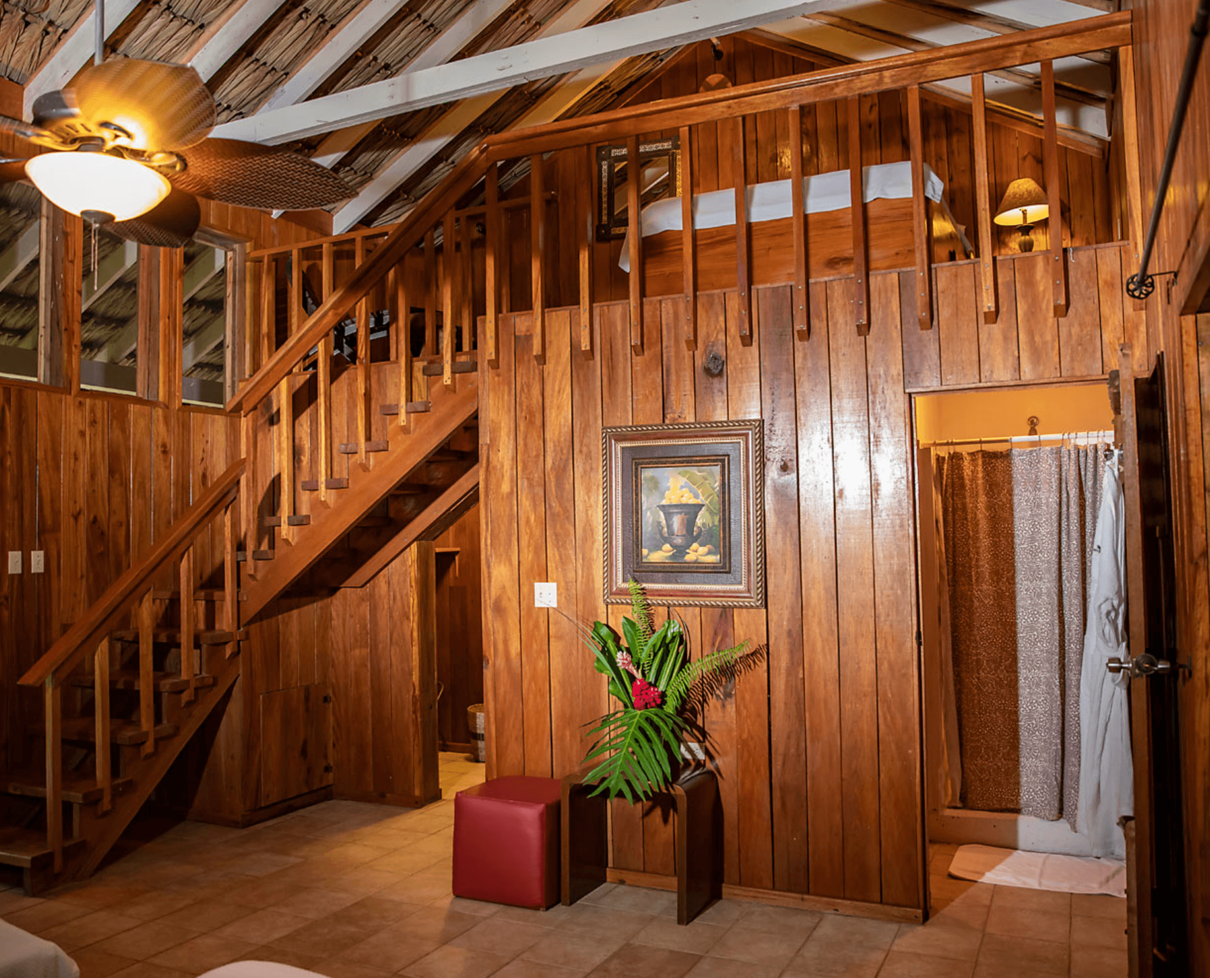 The Family Cabana with Loft offers ample space and comfort for families in a cozy jungle setting. The cabana features two double beds and one queen bed. The double-height rooms include a loft sleeping area, providing additional space for everyone. With modern amenities and a warm, inviting atmosphere, this cabana is the perfect spot for your family getaway in the heart of Belize's wilderness.